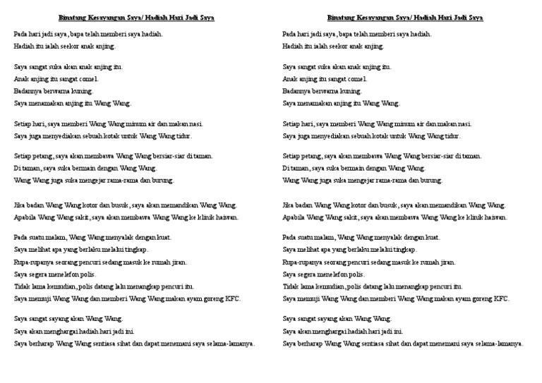 Aku mempunyai hewan kesayangan. Tanpa ibu kita tidak mungkin lahir ke dunia ini. Quite helpful for students to learn how to write a proper essay in Bahasa Melayu.